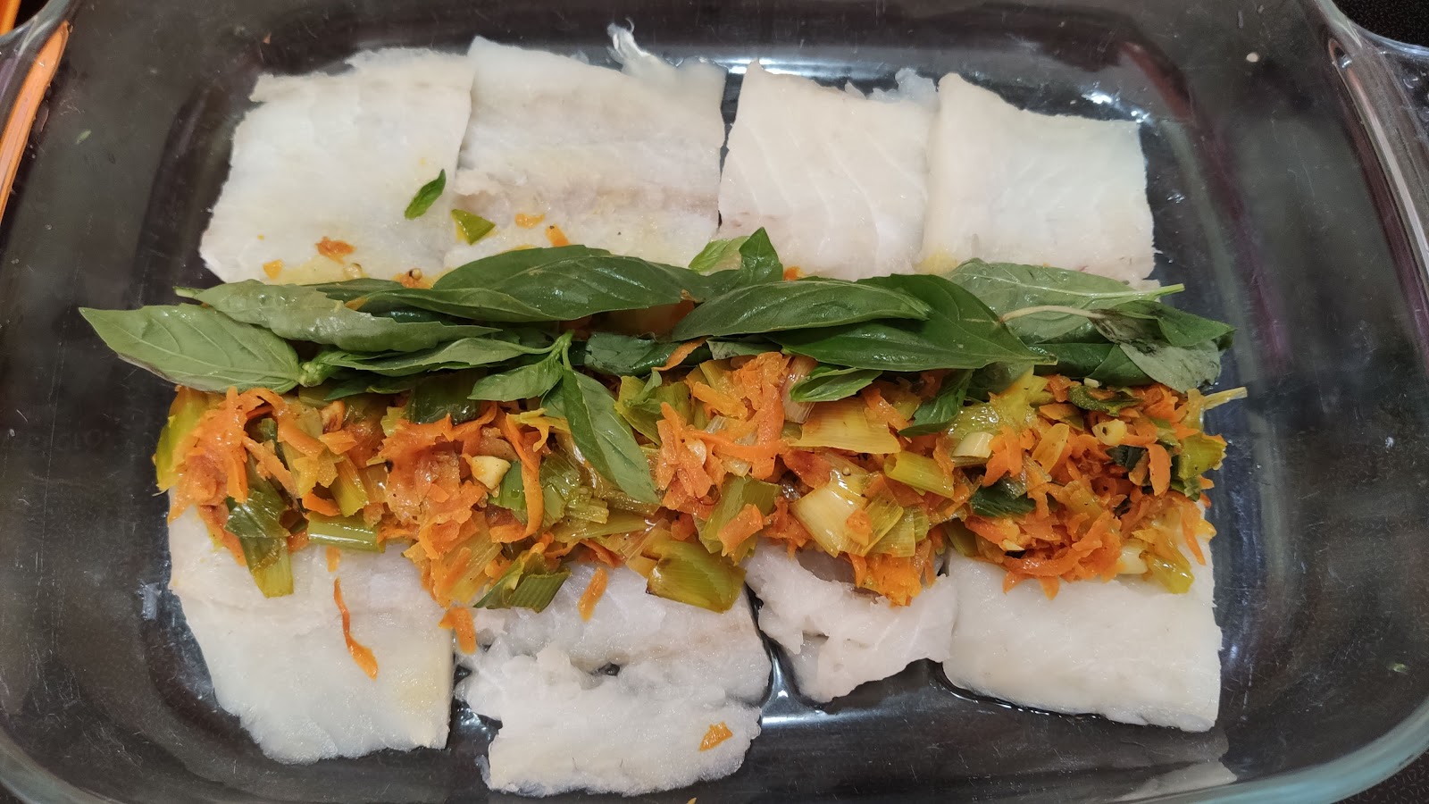 - Junte os lombos de bacalhau, a água, o caldo de legumes (ou sal) e uma pitada de pimenta. Envolva e deixe cozinhar em lume médio durante 8 minutos, mexendo de vez em quando.