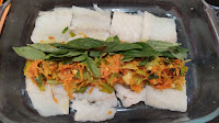 Preparação do Fricassé de Bacalhau Fresco (Tradicional):- Enquanto o arroz se coze no microondas, faz-se o peixe no tacho. Comece por picar a cebola e o alho para um tacho.