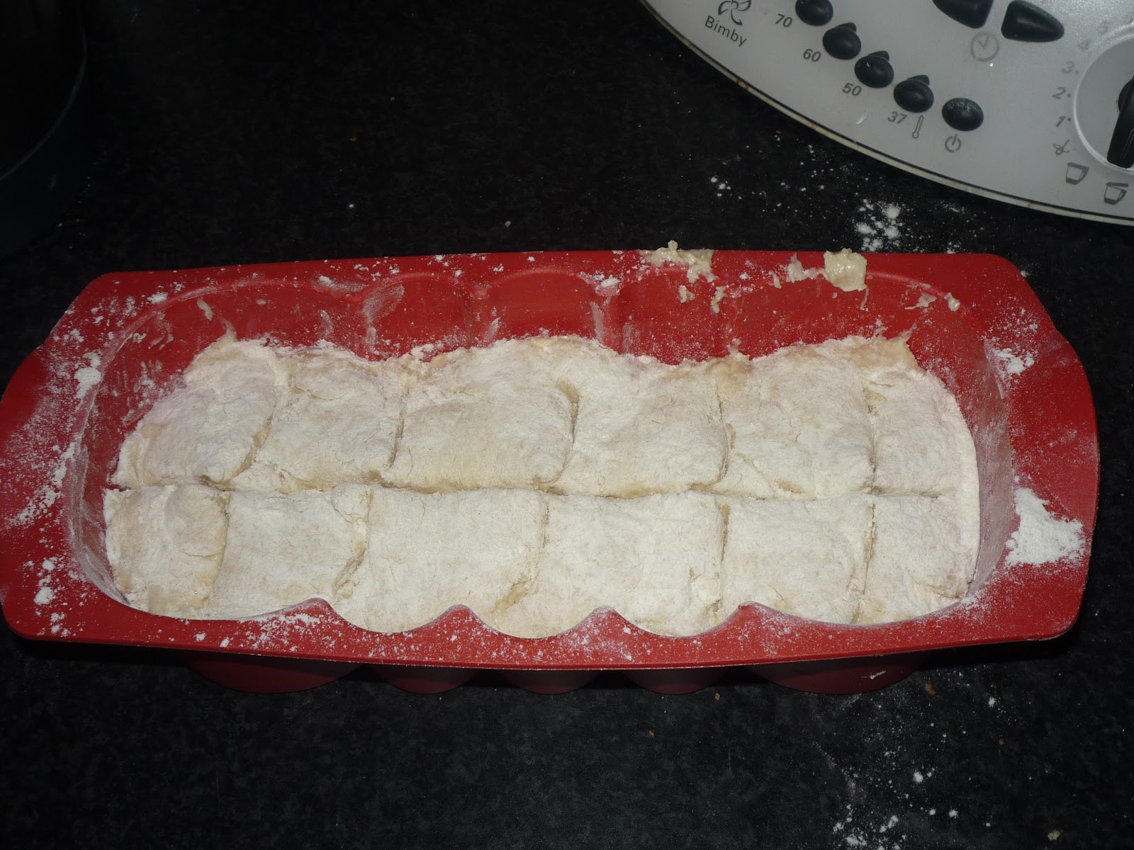 4. Deite a massa numa forma de silicone rectangular (tipo bolo inglês), polvilhe com farinha, dê um corte no meio no sentido do comprimento e leve ao forno cerca de 30 a 35 minutos.