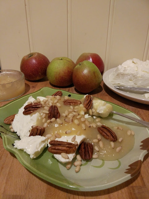 Outra opção maravilhosa e deliciosa para começar bem o dia. O queijo fresco foi feito em casa, tal como já publicado aqui. O puré de maçã faz-se muito bem e fica cinco estrelas, podendo servir como sobremesa, como acompanhamento de carne assada, ou como uma refeição assim pela manhã. Para completar, juntei as nozes e os pinhões que, para além de combinarem muito bem com o queijo e com a maçã, são ideiais para o funcionamento do nosso cérebro, perfeito para iniciar o dia!