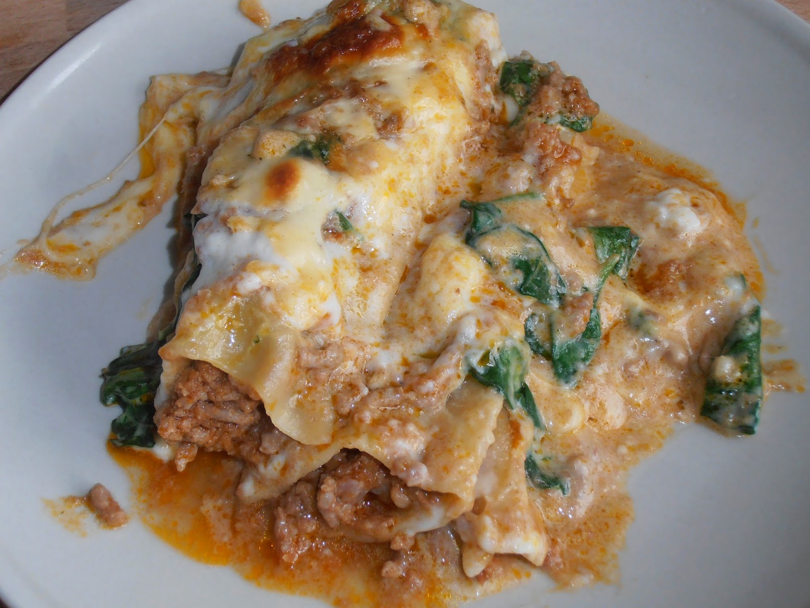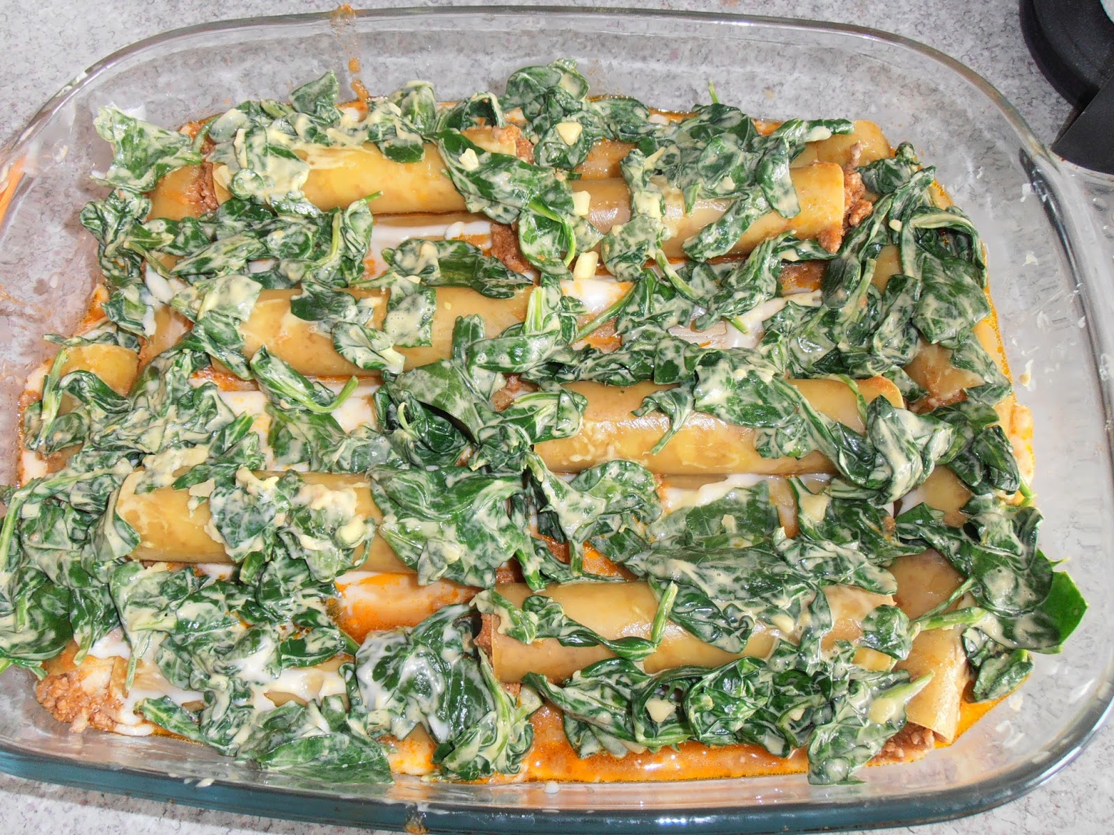 - Cubra o cannellonis com os espinafres e regue com o restante molho da carne.