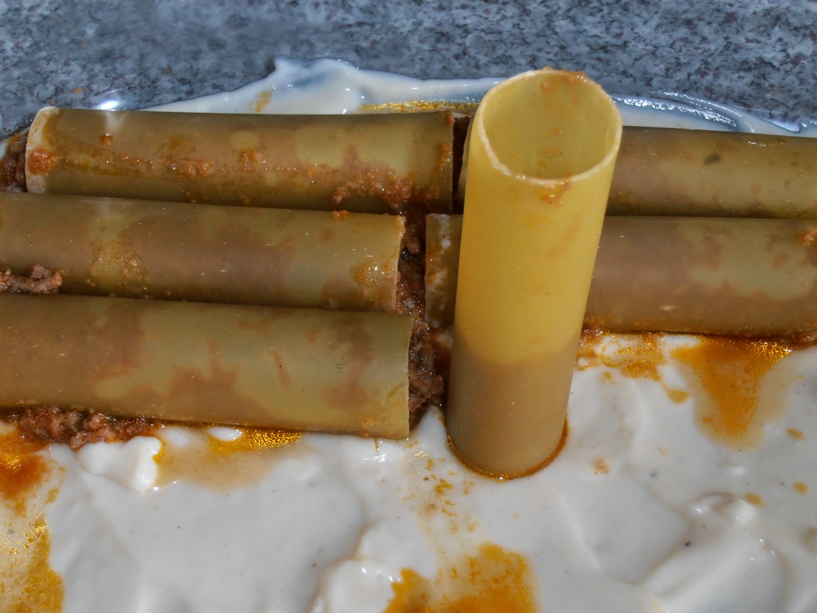 - Com um garfo (que ajuda a filtrar algum molho) vá enchendo cada um dos cannellonis na vertical, apoiados no fundo do tabuleiro, e assim que estiver recheado deite-o sobre o tabuleiro. Repita o processo para todos os cannellonis até preencher todo o tabuleiro. Se necessário formar outra camada, passe um pouco de béchamel sobre os cannellonis já no tabuleiro e continue a rechear os restantes que irão formar a segunda camada (no meu caso sobraram apenas 6 cannellonis que os coloquei mais ao meio do tabuleiro em segunda camada).
