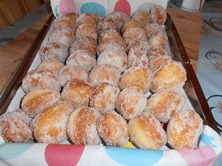 - Passe as bolas por açúcar enquanto quentes e coloque-as num tabuleiro.