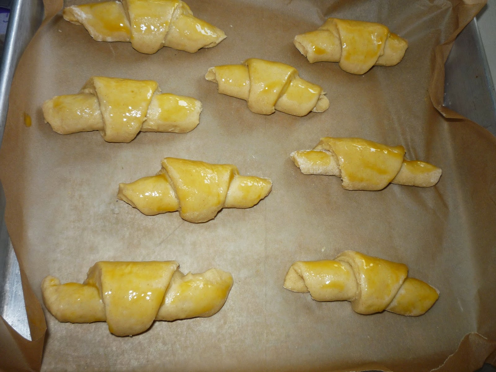- Pré-aqueça o forno a 180ºC, pincele os croissants com a gema e leve ao forno cerca 30 minutos ou até ficarem dourados. Retire e deixe arrefecer numa grelha.
