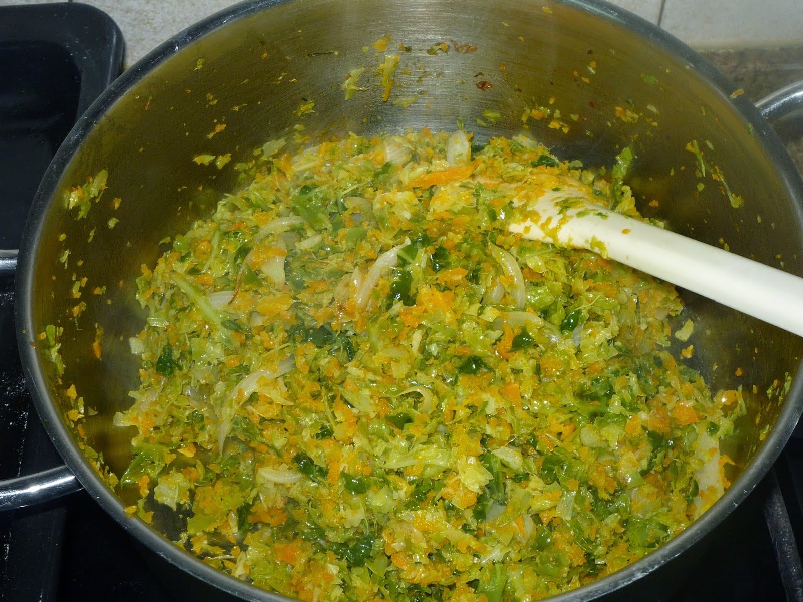 - Adicione o azeite e a cenoura ralada e leve a alourar cerca de 3 minutos em lume forte, a mexer com uma colher de pau.