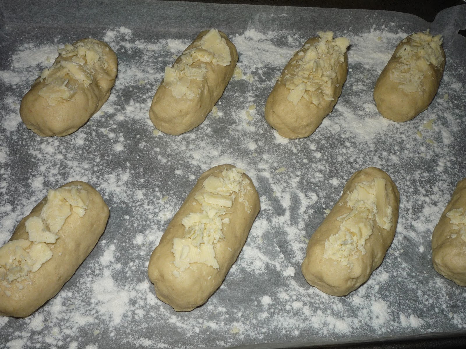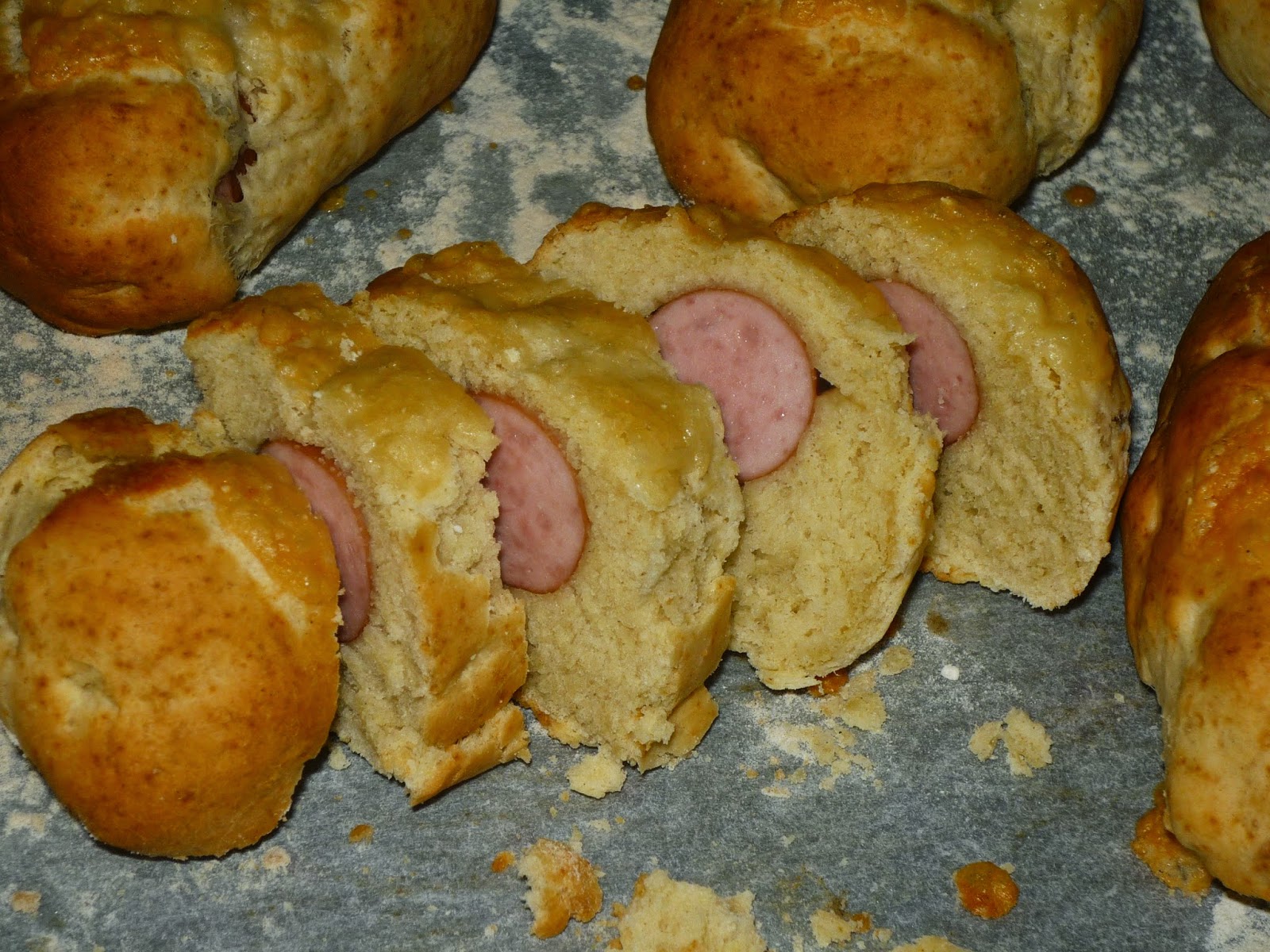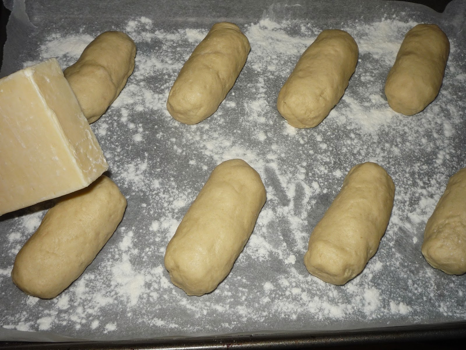 - Corte 15 rectângulos de comprimento um pouco maior que uma salsicha e de largura suficiente para cobrir toda a salsicha. Enrole cada uma das salsichas num rectângulo de massa e una bem a massa,