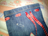 - Calças de ganga velhas, para cortar à medida da garrafa ou outra medida desejada e ainda para as letras ou aplicação a cozer na frente do saco, de preferencia de uma cor de ganga diferente.